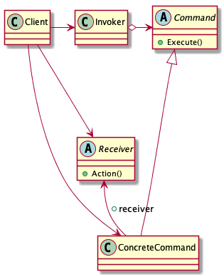 在类图中有三个角色:Receiver执行命令,命令传递链条最终到达这里;Command即声明的命令;Invoker接收并执行命令。