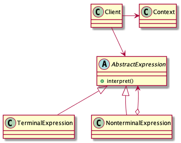 类图中AbstractExpression是TerminalExpression和NonterminalExpression的抽象。 TerminalExpression即终结符表达式,实现与文法中元素相关联的解释操作,一般只会有一个终结符表达式。