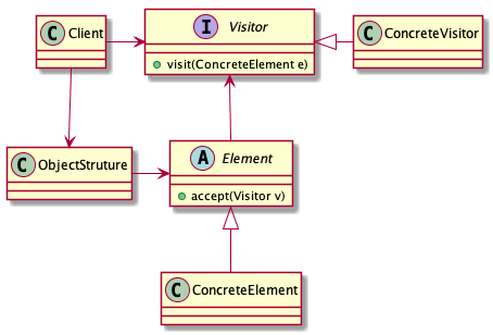 Element元素角色定义接受哪一类访问者访问,具体通过accept方法参数定义,方法体里通常是visitor.visit(this)写法;